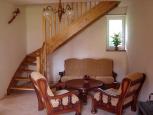 K dispozici 7 lůžek + přistýlka. V přízemí vstupní chodba, odkud se vchází do obytné místnosti s kuchyní. V podkroví dvě ložnice a koupelna. 1. ložnice - 3 postele a přistýlka (vysunovací lůžko), komoda na prádlo, noční stolek. 2. pokoj má dvojlůžko a jednu postel. Obývací místnost - velký kulatý stůl (možno rozložit na oválný), sedací souprava, krbová kamna a TV. Vybavená kuchyň - rychlovarná konvice, lednice, mikrovlná trouba. V chodbě renesanční komoda ze světlého dřeva. Koupelna - velká rohová vana, záchod, skříňka na umyvadlo a zrcadlo. Sauna přístupná z boční strany chaty. Kryté venkovní posezení přímo u chaty nebo společné i pro vedlejší dům, kde bydlí majitelka objektu a který je možno také pronajmout (celkem 9 lůžek). Na velkém neoploceném pozemku kryté posezení s krbem, pro děti trampolína o průměru cca 4m. Rybník a potůček na hranici pozemku. Možnost svezení dětí na koních. Parkování u objektu. Malý pes povolen. Cena nezahrnuje spotřebu vody,energie, dřeva, rekreační poplatek a poskytování ložního prádla. Obchod 2km, restaurace 8km.