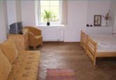 Čtyři samostatná studia dvou až čtyřlůžková (max 16 lůžek) v nově zrekonstruované bývalé škole. Každé studio s vlastním kuchyňským koutem (el.vařič, chladnička, varná konvice, překapávač, nádobí) a vlastním sociálním zařízením (sprchový kout, WC, umyvadlo). Centrální vytápění. Možnost úschovy lyží, kol. Pro nejmenší k dipozici postýlka. Možnost využití soukromé vinárničky. Posezení venku, ohniště. Objekt je velmi vhodný i pro pořádání malých rodinných oslav. Každý den cyklobus. Po dohodě možnost pobytu se psem.